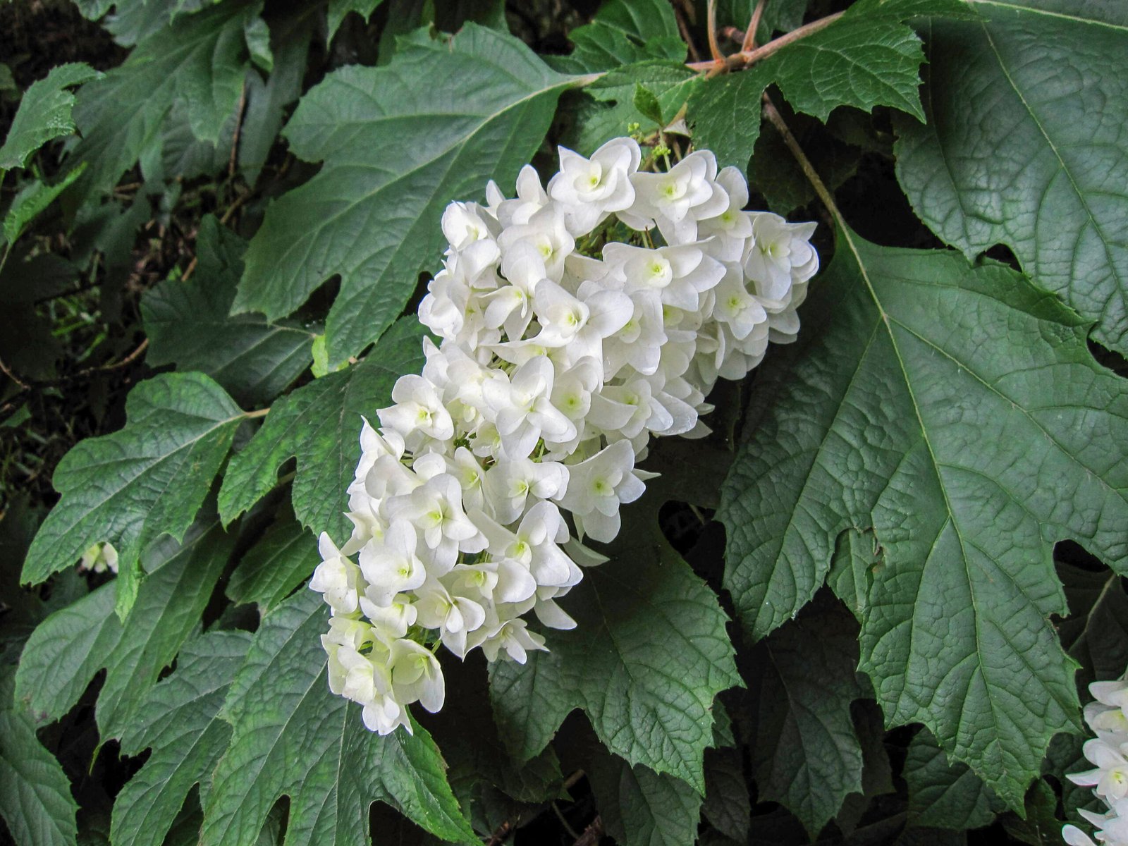 Ąžuolinių hortenzijų (H. quercifolia), kaip rodo pavadinimas, lapai primena ąžuolų lapus. Žydi sezono pradžioje, žiedynai yra kūgio formos, pražysta kreminės arba žalios spalvos, palaipsniui tampa rausvos. Ši rūšis žydi ant senos medienos, o tai reiškia, kad karpyti reikia atsargiai ir iškart po to, kai ji nužydi. Genėjimas labiau reikalingas tuo atveju, kai reikia kontroliuoti augalo dydį, bet ne skatinti augimą.