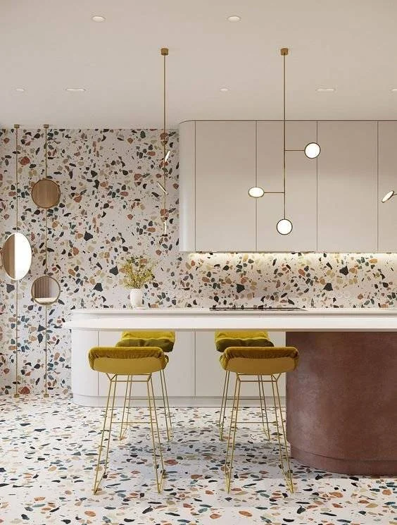 „Terrazzo“ savo gyvenimą pradėjo kaip komercinių patalpų grindų danga. Tačiau dėl 2020 m. interjero dizaino tendencijų „terrazzo” namuose sutinkamas vis dažniau ir vis įvairiapusiškiau.